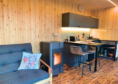 Nejste-li typy „pod stan“, můžete si vybrat dřevěnou kabinu. Takový luxus „v kostce“. Kabina je vybavena ložnicí, ze které máte výhled přímo do krajiny. Obývací prostor s plně vybavenou kuchyňkou a peletovými kamny. Už jste objevili výhody vytápění peletovými kamny?